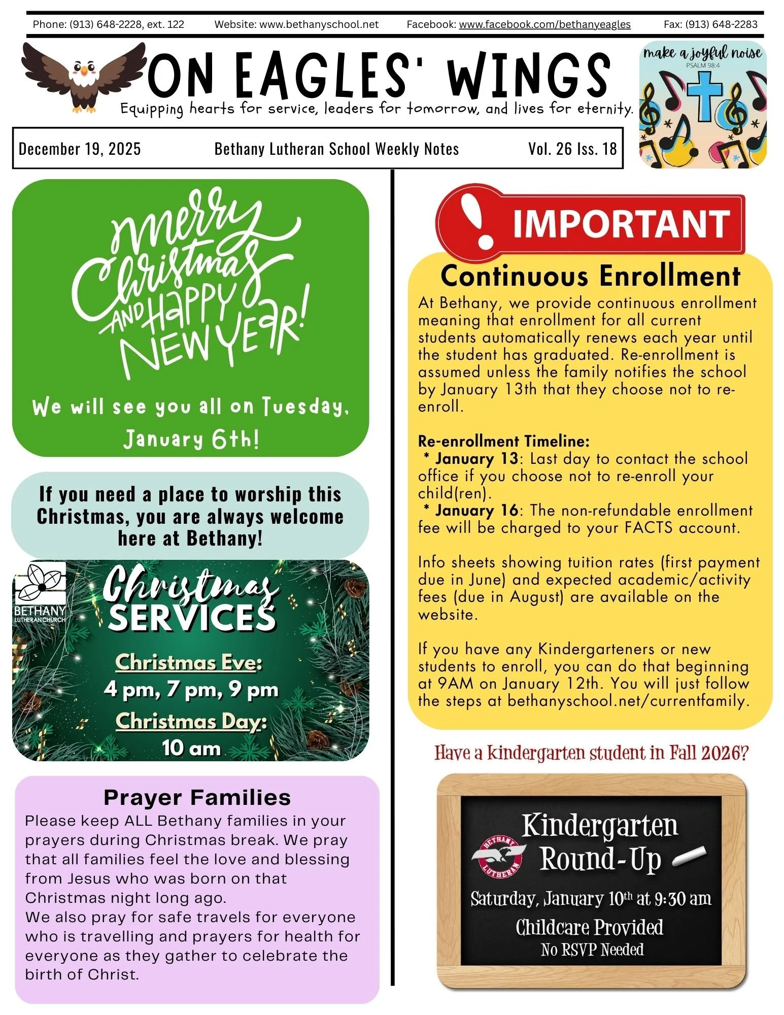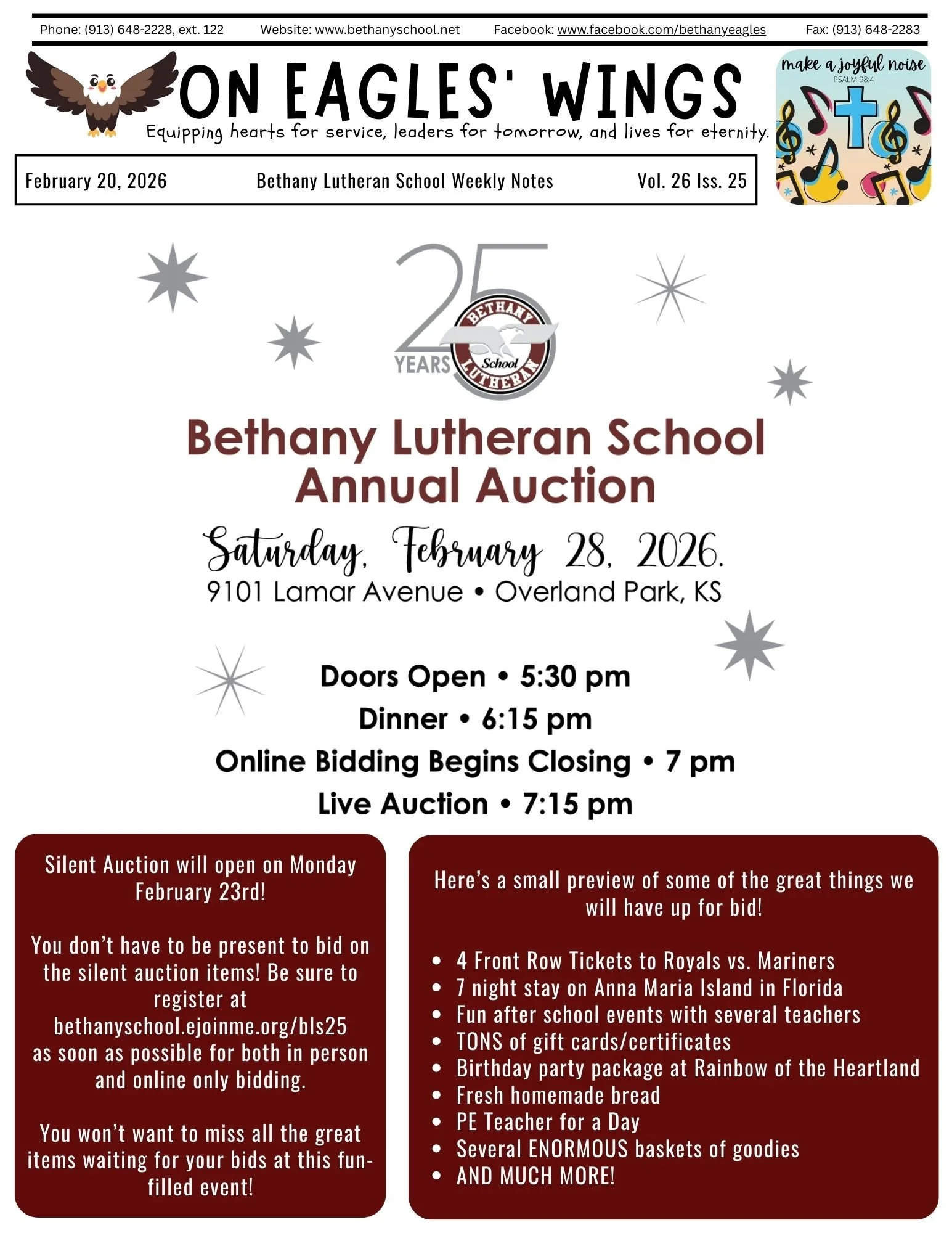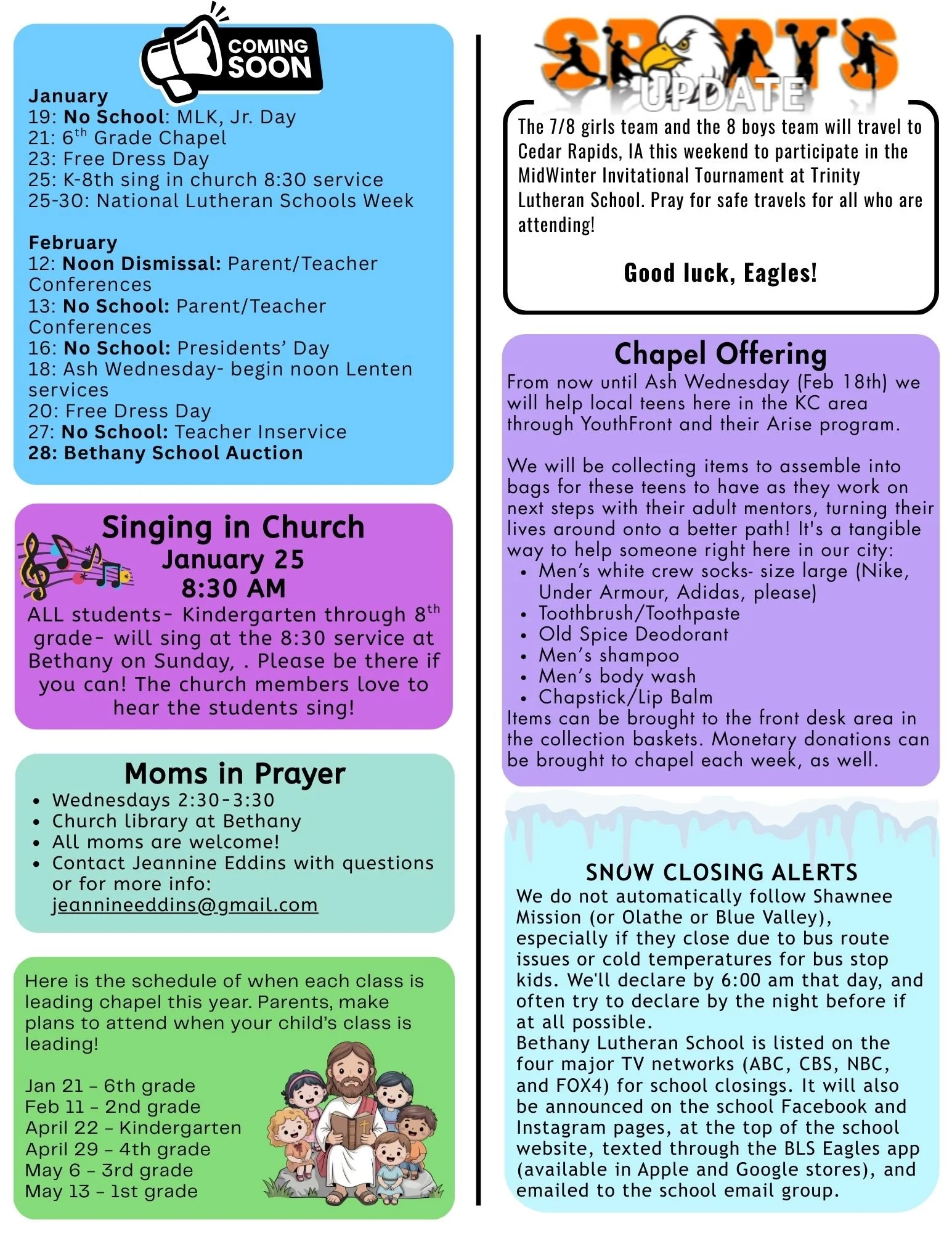 Our newsletter, called “On Eagles’ Wings”, is distributed weekly by email and a paper copy is sent home in Friday Folders. If you would like to include something in the newsletter, submit written articles to frontdesk@bethanyschool.net by Wednesday at 3:00 pm for inclusion in the Friday newsletter.