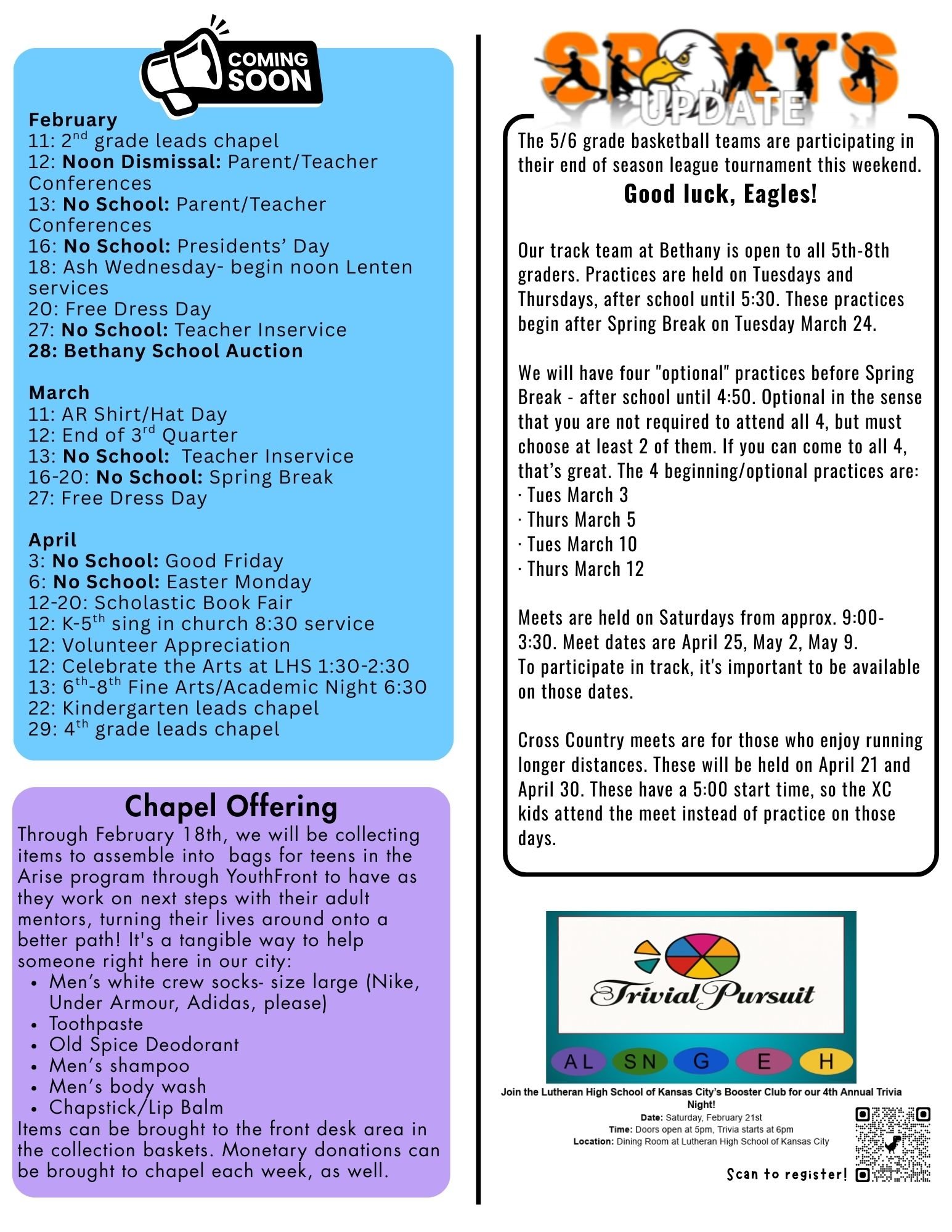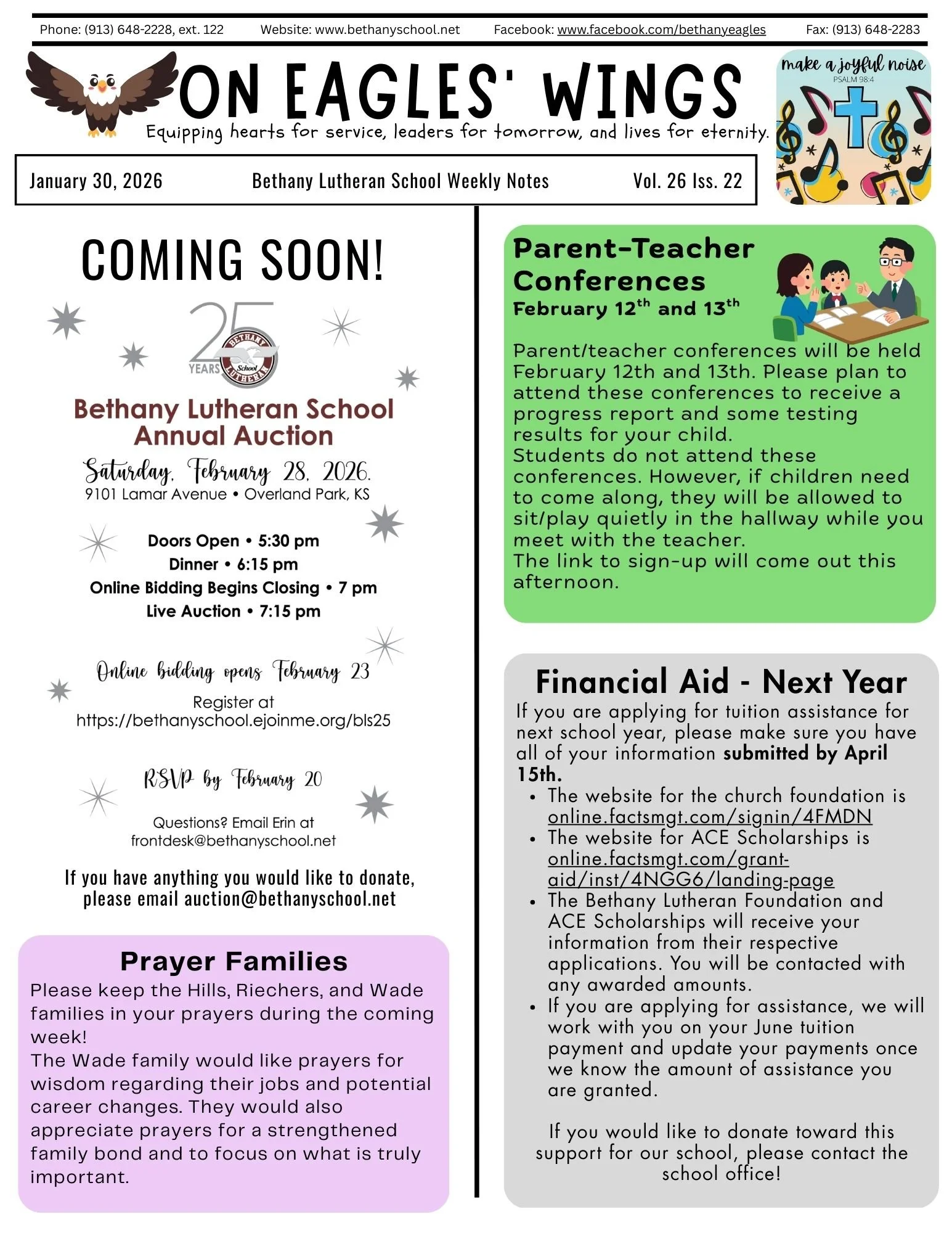 Our newsletter, called “On Eagles’ Wings”, is distributed weekly by email and a paper copy is sent home in Friday Folders. If you would like to include something in the newsletter, submit written articles to frontdesk@bethanyschool.net by Wednesday at 3:00 pm for inclusion in the Friday newsletter.